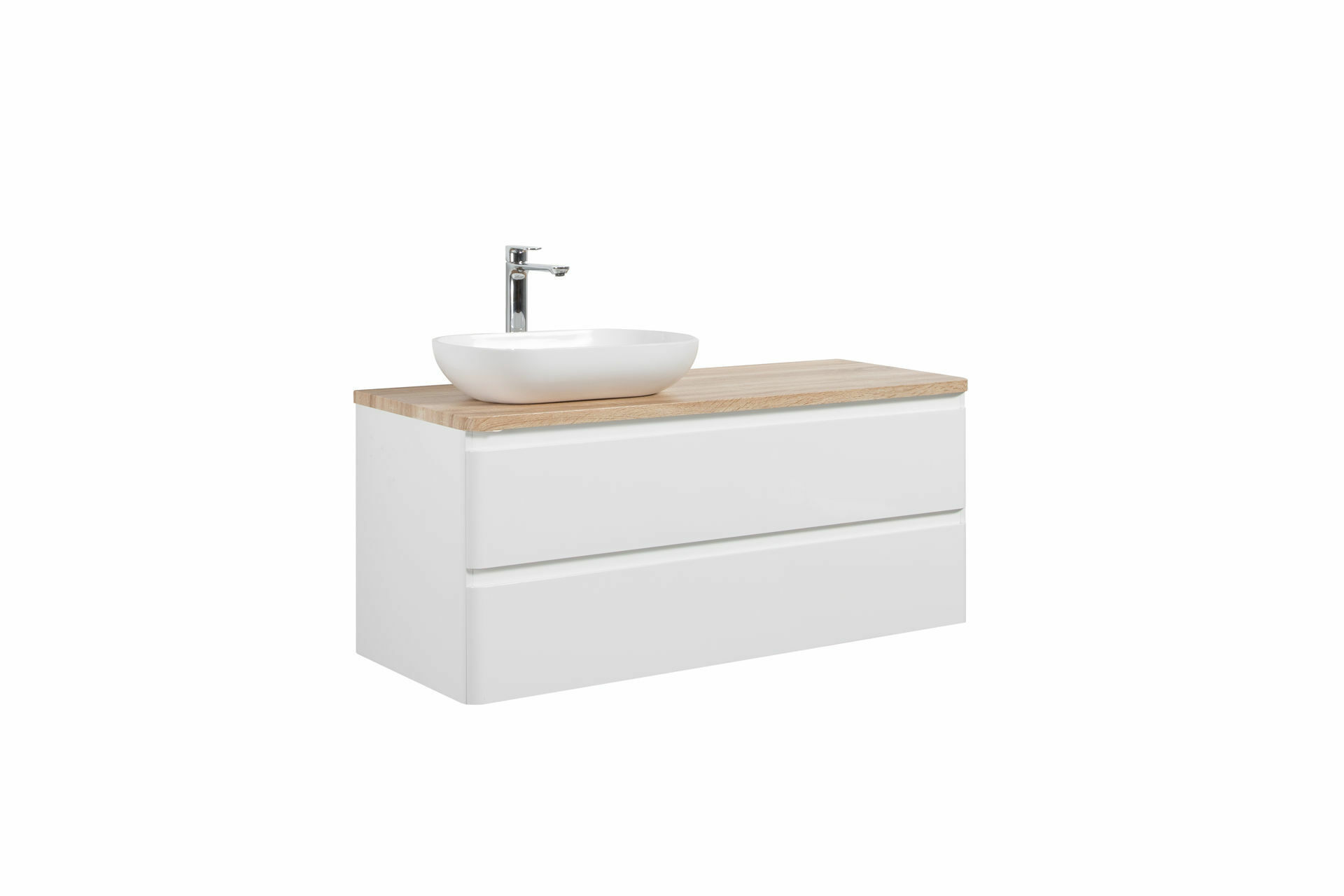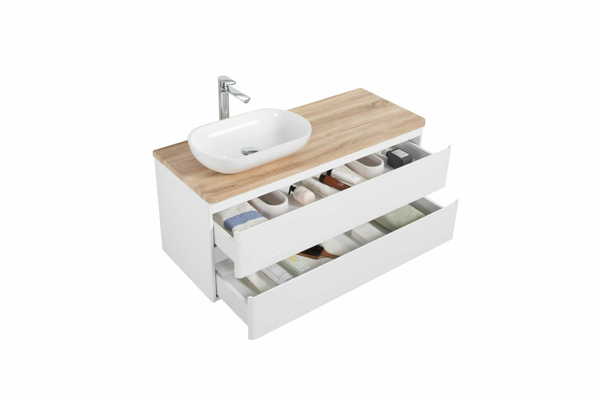 The Lazio 1200 bathroom vanity features soft closing double drawers, a Suddekor laminate wood top manufactured in Germany and deep spacious drawers for all your storage needs.