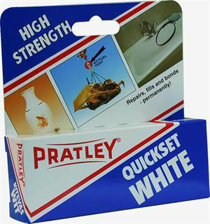 Pratley Quickset Glue is an high strength adhesive which sets quickly and adheres to most rigid materials like ceramics, stone, concrete, glass, fibre, glass and metals. White Glue is best for heavy duty applications where surfaces are somewhat rough. It does not run easily and is ideal for gap filling. Clear Glue can be used where a more runny consistency in close matching joint is required.