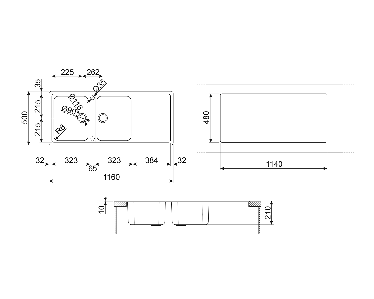 SMEG GRANITE DOUBLE BOWL INSERT SINK 1160 x 500 x 210 mm BLACK